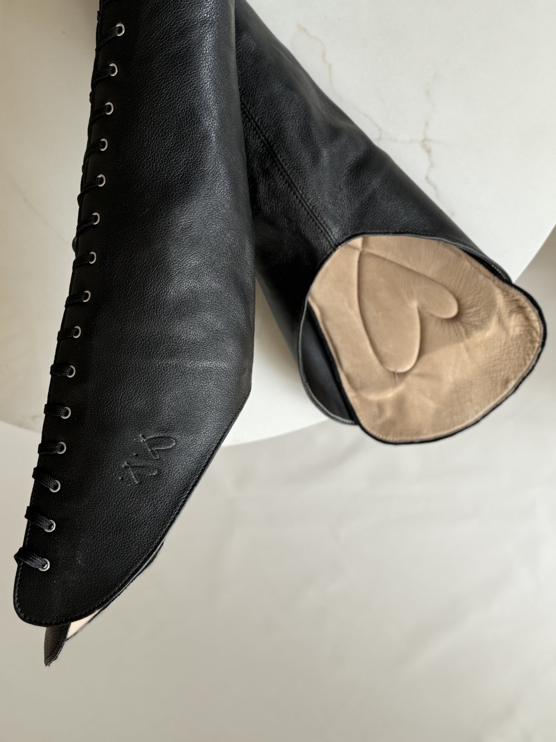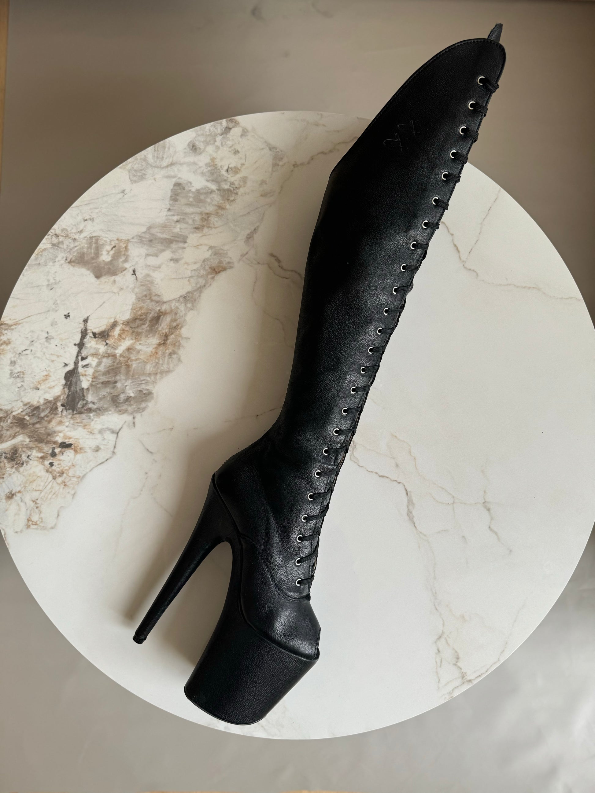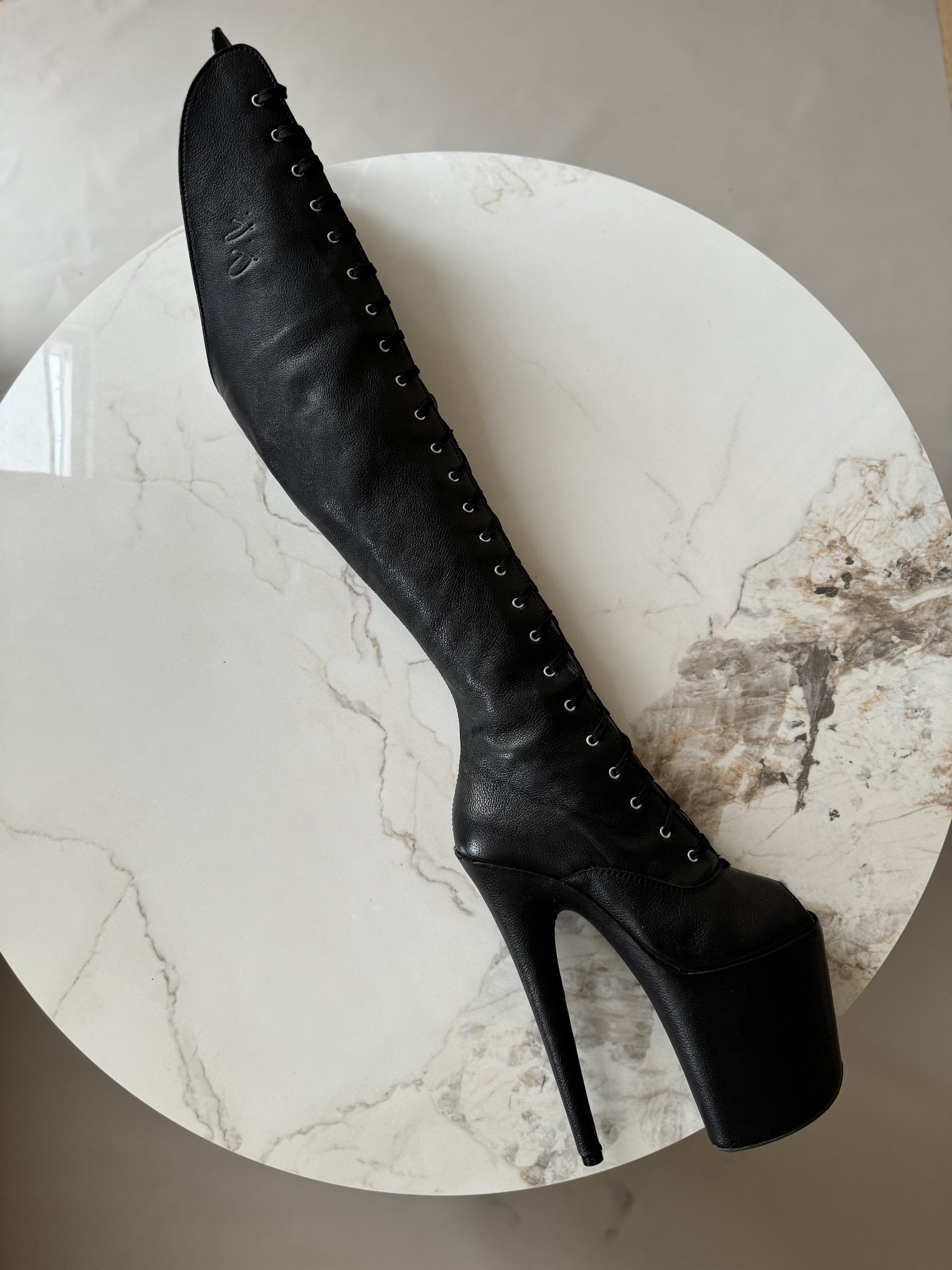 Crafted from genuine leather in black color with caviar finish, these over-the-knee boots are a statement in both luxury and intention. The ultra soft texture delivers comfort without compromise, while the striking silhouette is set on a reused 8-inch Pleaser platform, fusing sustainability and delivering ergonomic fit on best platforms on the market.
