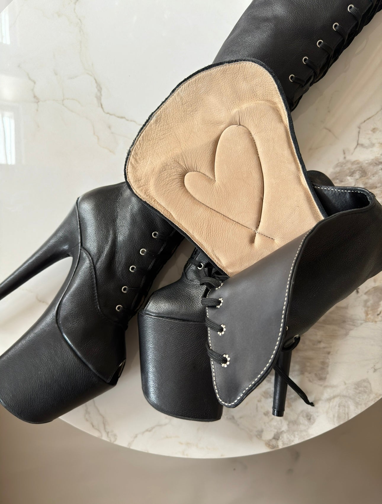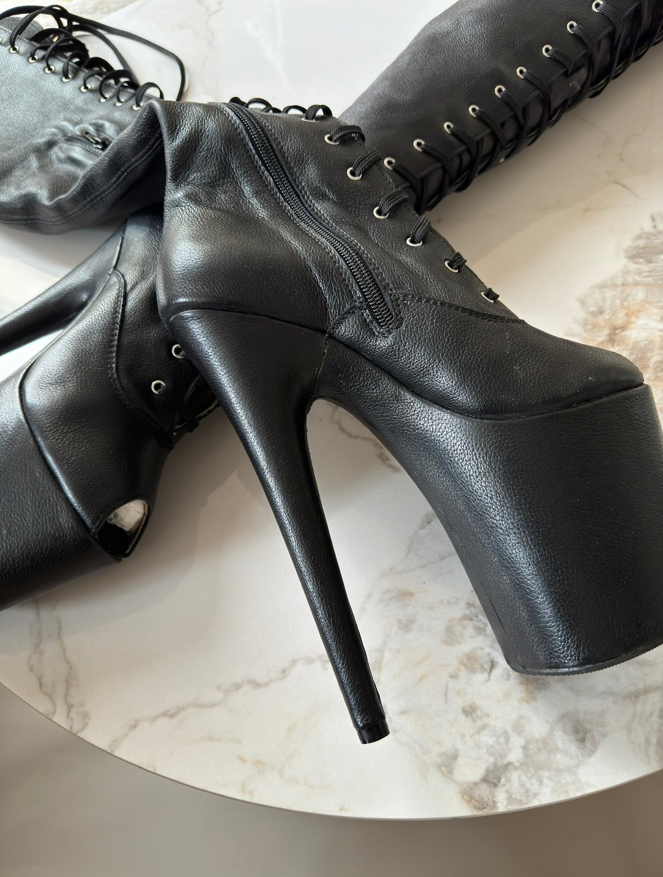 *made from recycled Pleaser platform(flamingo model) and leather leftovers from Italian luxury brands, the dressed platform can give relief look at some parts due to recycling part