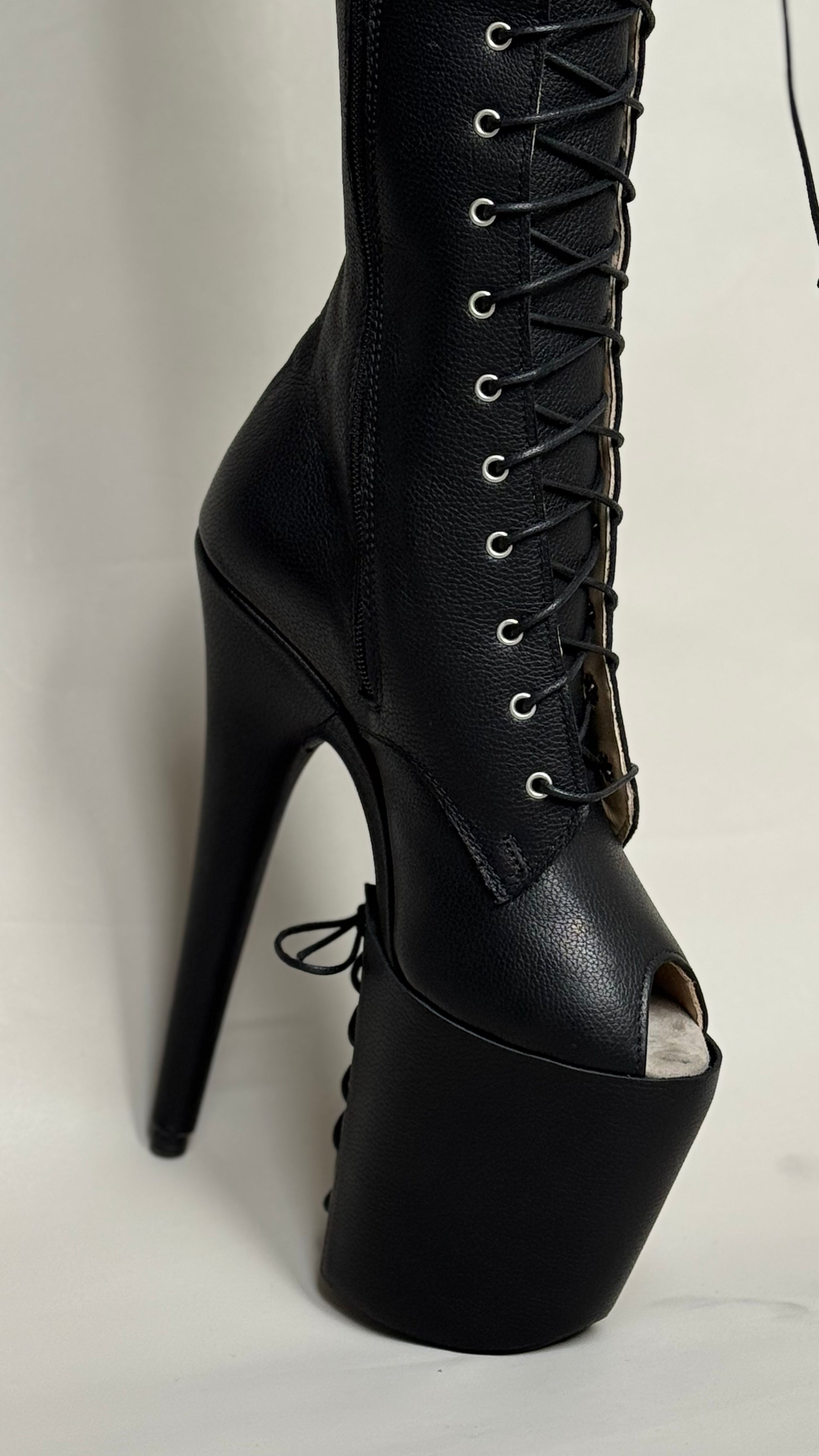 Crafted from genuine leather in black color with caviar finish, these over-the-knee boots are a statement in both luxury and intention. The ultra soft texture delivers comfort without compromise, while the striking silhouette is set on a reused 8-inch Pleaser platform, fusing sustainability and delivering ergonomic fit on best platforms on the market.