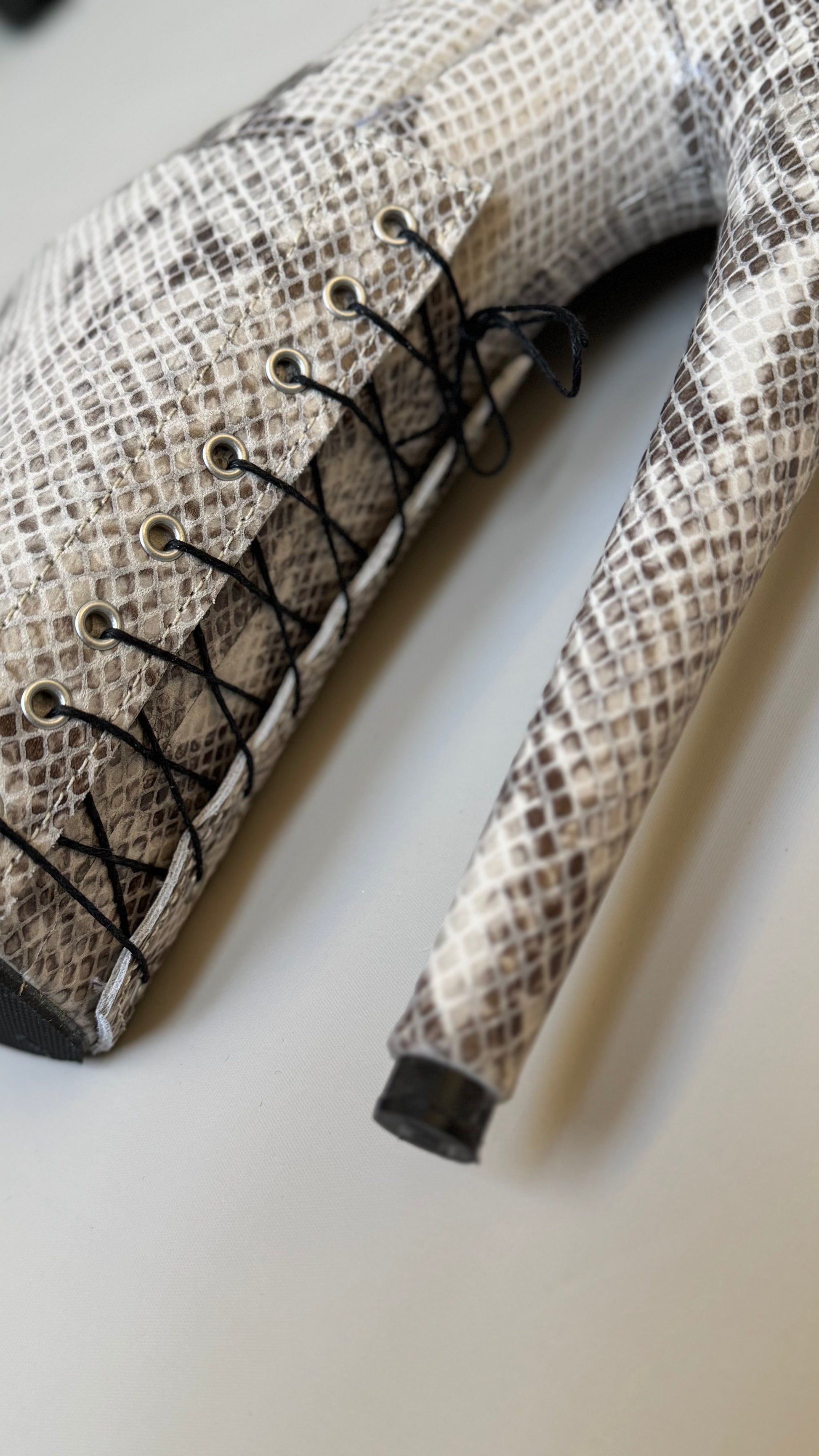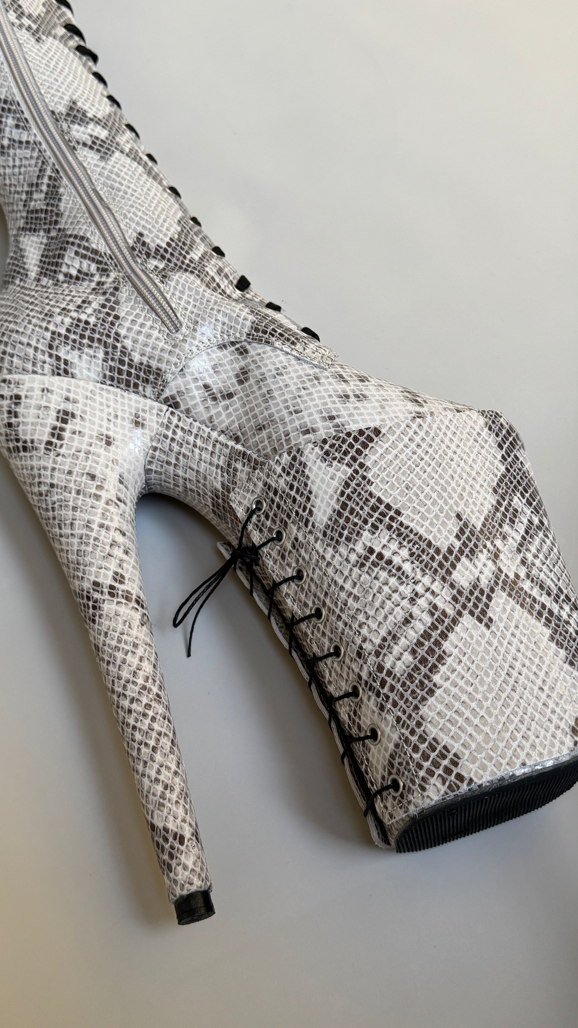 These over-the-knee boots are crafted in genuine calfskin leather with a striking beige-grey snakeprint, a pattern that commands attention while seamlessly blending with any outfit. The patent finish adds a subtle glam, transforming every step into a statement of intention and elegance. Each pair features a unique snakeskin pattern. Your boots will never look exactly like anyone else’s.